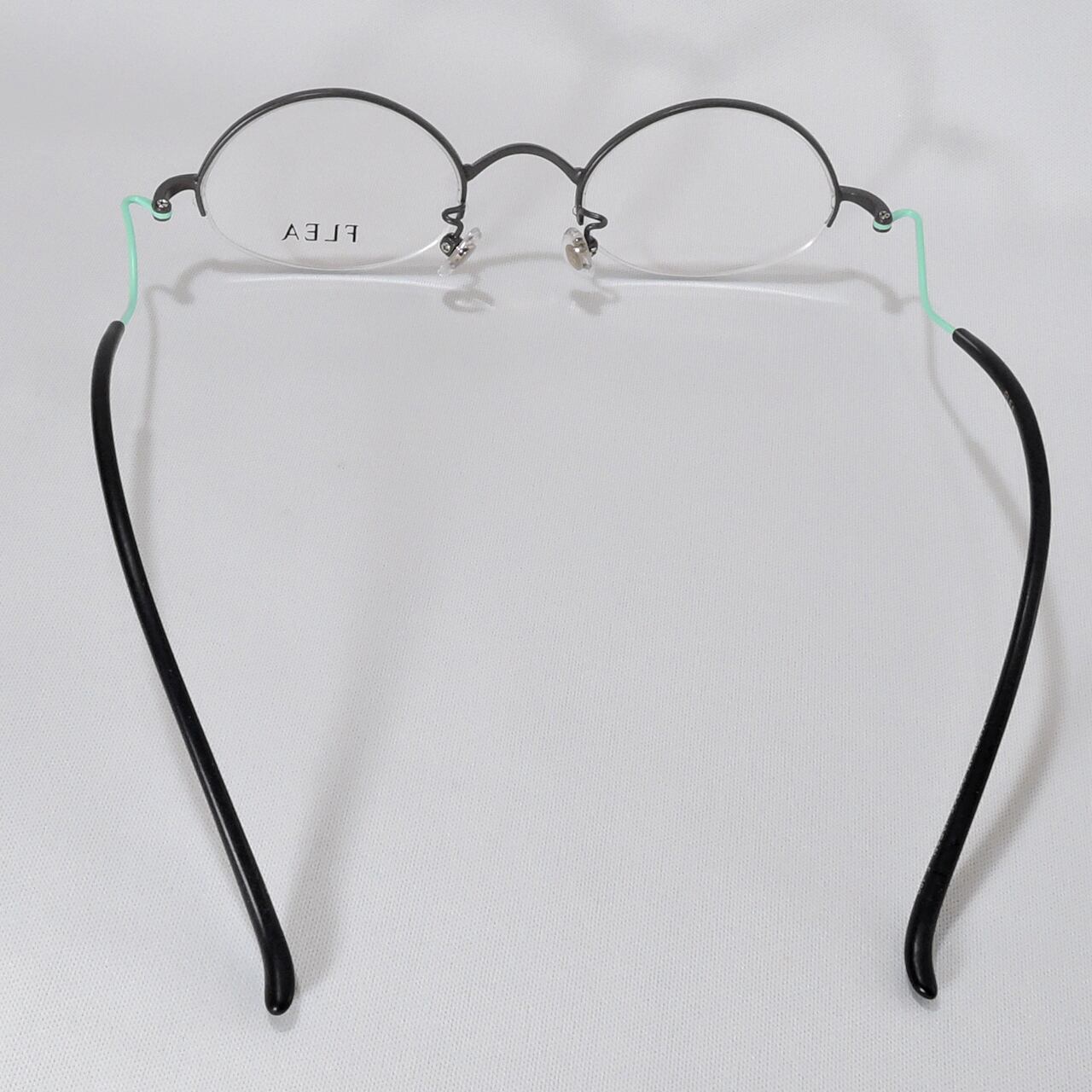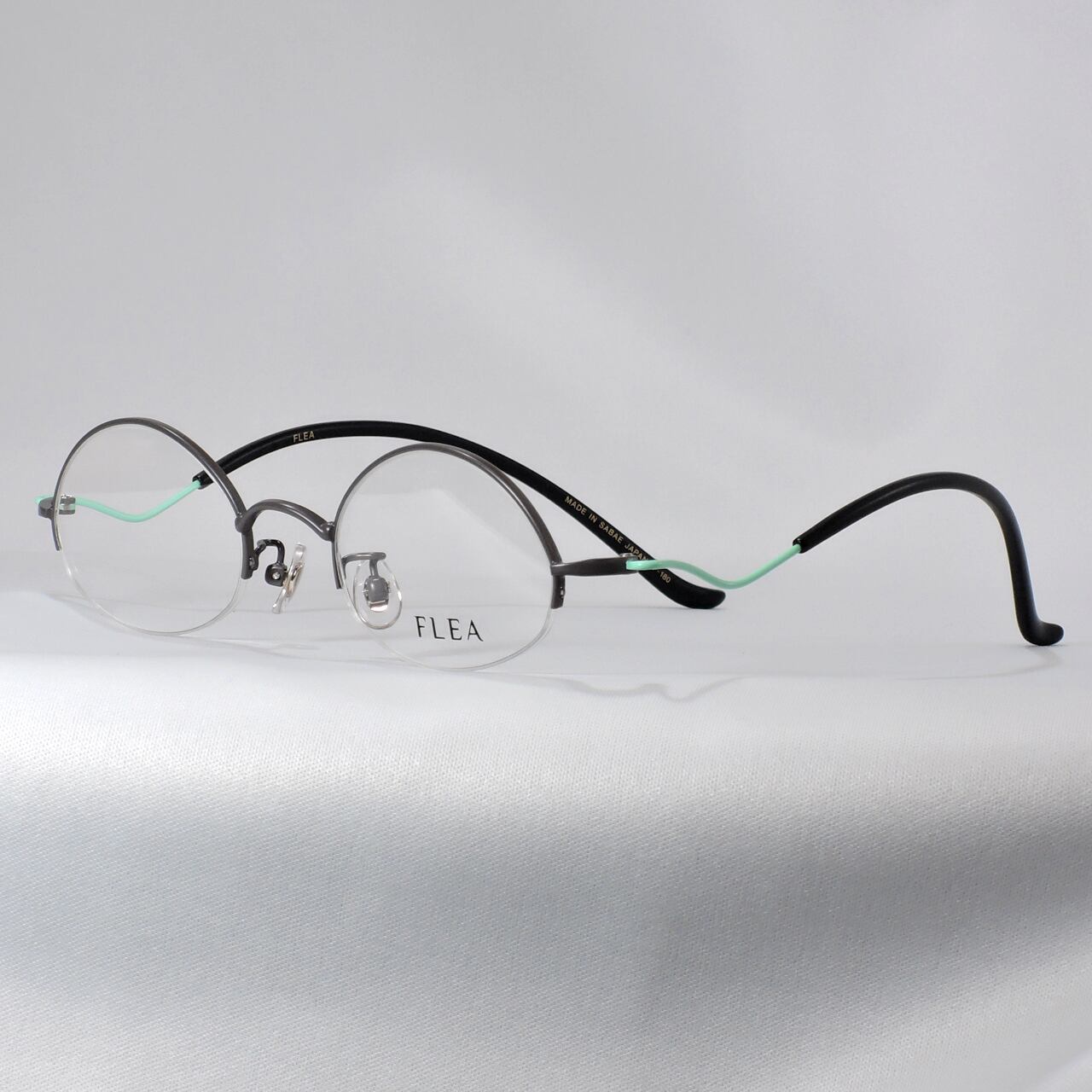 フロントはグレイ、テンプルに明るいミントグリーンを採用したカラフルな色合いのメガネです。