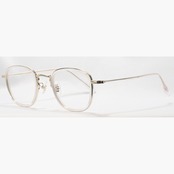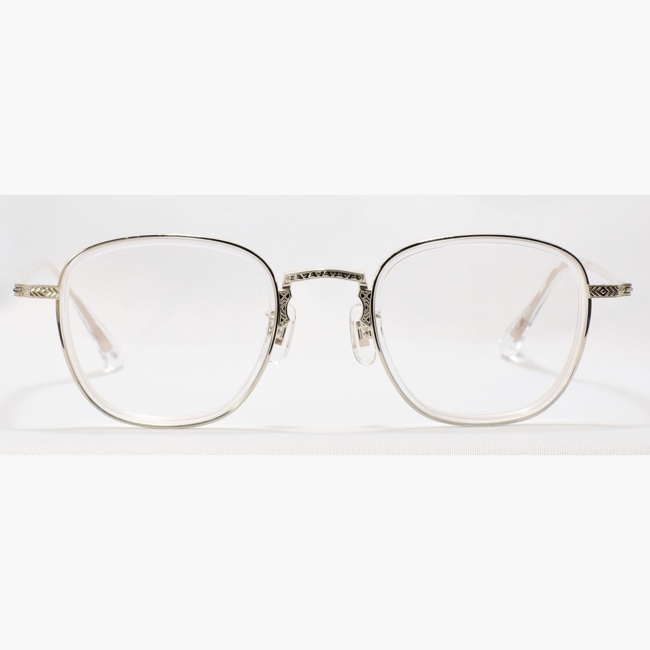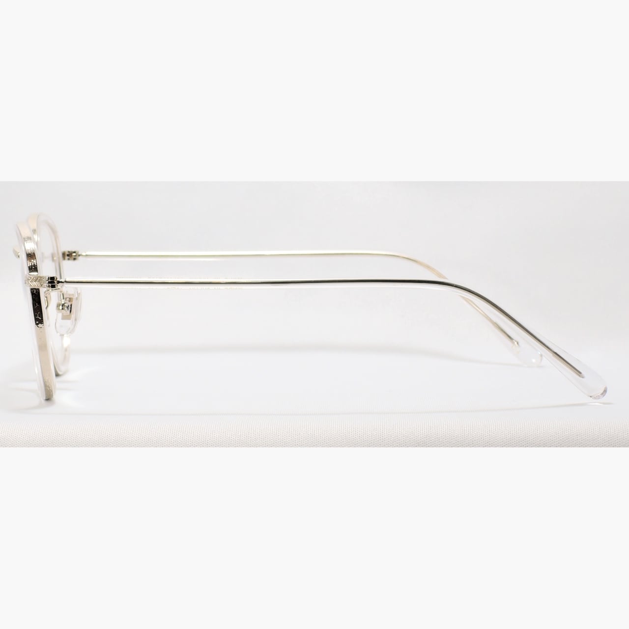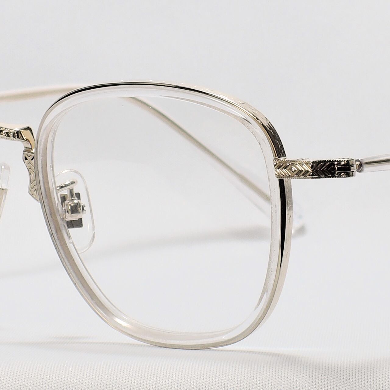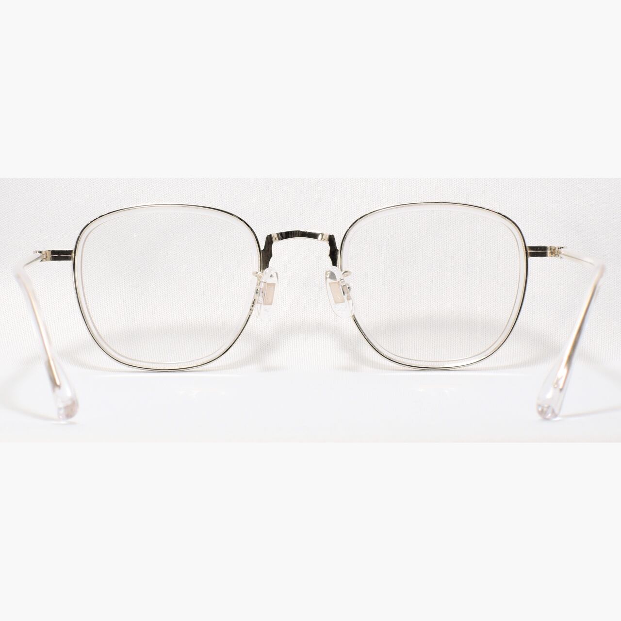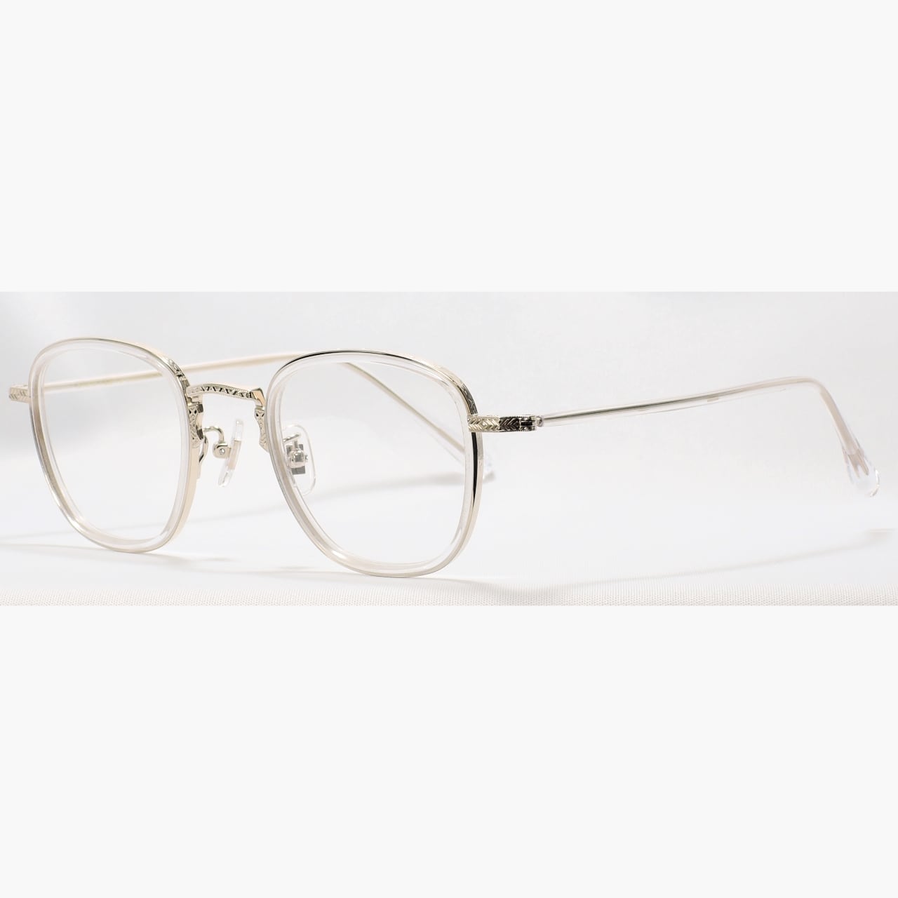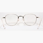 正方形に近いスクウェアのフロントは金色のチタンリムにクリアアセテートをはめてあります。セル巻き、ワッパなどと呼ばれる眼鏡です。テンプルは長モダン仕様。